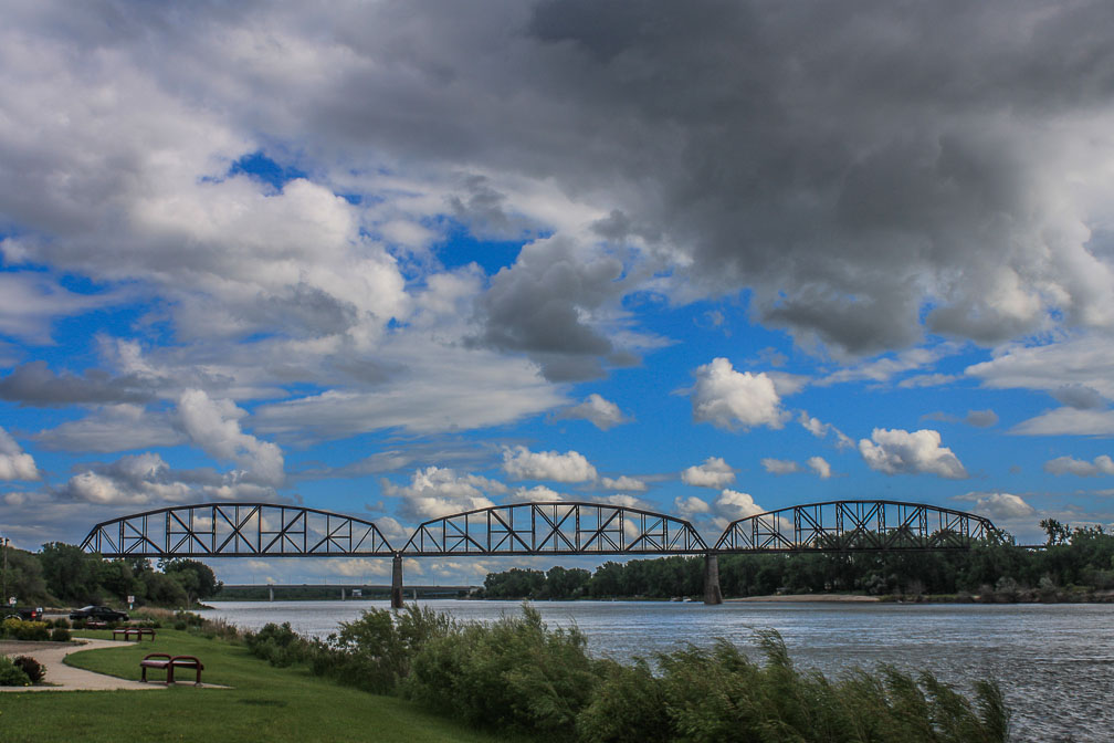 Something about the clouds in the Dakotas intrigued me. They seemed different from anywhere else, more fluid, more dramatic, sharper and livelier. One of the best places to admire them and let your imagination fly is in Keelboat Park, on the shore of the Missouri River, where they soar high above you and the attractive Northern Pacific Railroad Bridge. But what happens when the sky is clear or completely overcast? No worries. You can also learn a little local history that dots the trail as it wends its way through the park. Informational signs present historical facts about the area during the time of Lewis and Clark’s expedition. You can climb on board a 55′ full-scale replica keelboat similar to the one used by the explorers. Then circle around the park’s main attraction—the Thunderbird sculpture, measuring 15′ high and 30′ across. Four giant thunderbirds emerge from a thundercloud in four different directions, heads and talons thrust forward. Created by student artists from the United Tribes Technical College, the sculpture pays homage to the legendary creature in certain North American indigenous peoples’ culture. Plaques around the sculpture explain the variances in the bird’s mythology among the different nations.