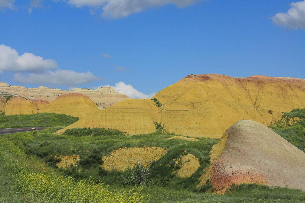 I reaped the rewards of a drive east along the eerily deserted Route 44 from the ghost town of Scenic with a sneak peek at Badlands National Park in southwestern South Dakota. Anyone traveling on Interstate 90 to the north simply doesn’t have this view, and I was glad I had filled the gas tank so that I could appreciate this underutilized alternative to the park’s main entrances. The geologic formations of the park looked surreal, and even at a distance I could discern the treeless layers of sedimentary rock that rose abruptly from the grassy prairie, remnants of millennia of sediment deposits when the park was part of the ancient sea that stretched across the Great Plains. By the time I drove into the park at the Interior Entrance, I was primed for something remarkable. The Badlands Loop Road weaves its way around the buttes, spires, and pinnacles, but it wasn’t until I neared the end of the route that I found the Yellow Mounds. These giant yellow bumps, often topped with layers of rusty purple, formed when the upper levels of shale weathered into a fossil soil, or paleosol. Against the green grass and blue sky, they made the final few miles of, and my exit from, this national park unforgettably dramatic.